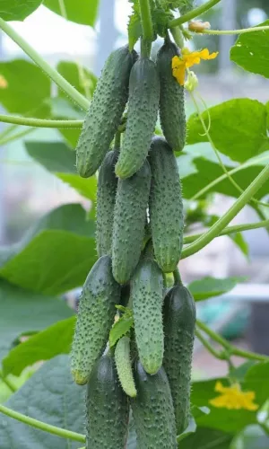 (2-5 в узле).Зеленцы бугорчатые,белошипые,длиной 12-15 см.Вкусовые и засолочные качества высокие. Имеет длительный период плодоношения, вплоть до заморозков.