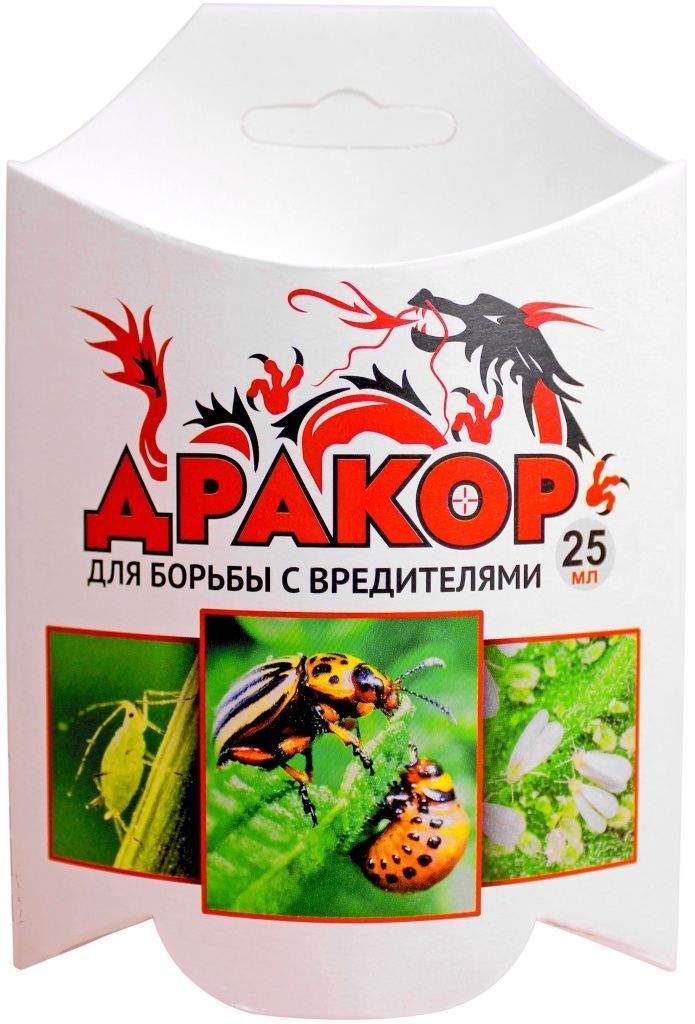 Инсектицид последнего поколения «Дракор» — это системный препарат пролонгированного действия: на 2-3 недели растения защищены от нападения листогрызущих и сосущих вредителей. Остаточное действие сохраняется до 40 дней. Действующее вещество препарата «Дракор» — клотианидин, это нервно-паралитический инсектицид контактно-кишечного действия. Смерть насекомого наступает практически мгновенно при непосредственном контакте с инсектицидом или после поедания листьев, обработанных препаратом.