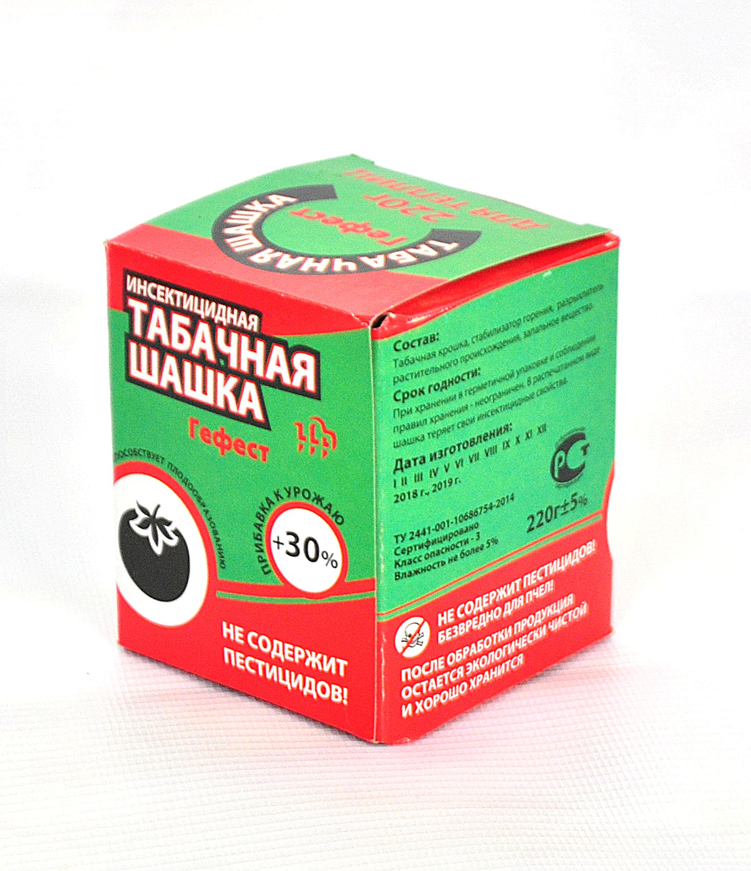 Шашка табачная дымовая ГЕФЕСТ применяется для окуривания парников и теплиц в целях борьбы с насекомыми-вредителями: тлей, медяницей (в период окрыления), листоверткой, белокрылкой, паутинным клещиком и другими.